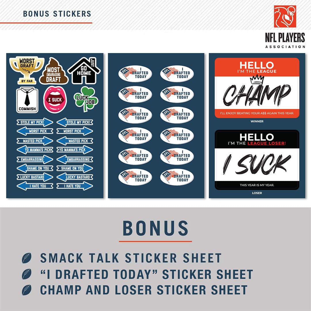 + 12 "I Drafted Today" stickers, a full sheet of Smack Talk stickers, and a Hello I'm Champion + Loser stickers.
