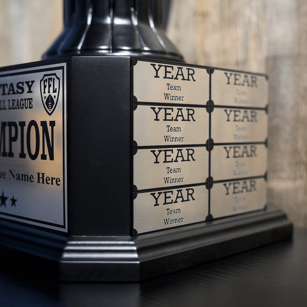 Do you see this beauty? Our Fantasy Football Perpetual Trophy is not for the faint of heart. This awe-inspiring Fantasy Football Trophy is built to command the attention of everyone, look great on your mantle, and remind each member of your league how badly you beat them. Our Perpetual Trophies are designed and manufactured only by TrophySmack - talk about an exclusive opportunity for greatness!
