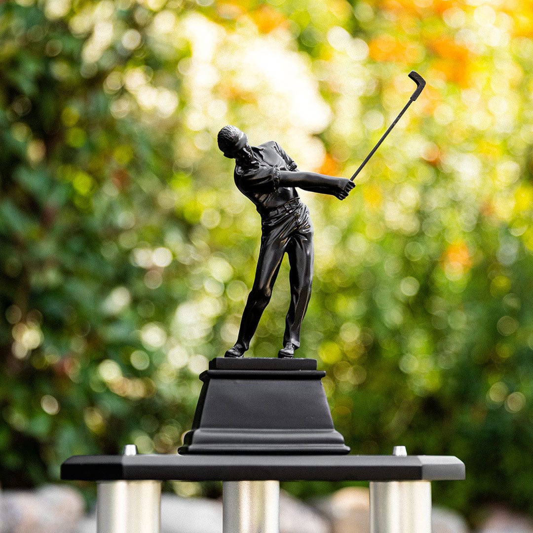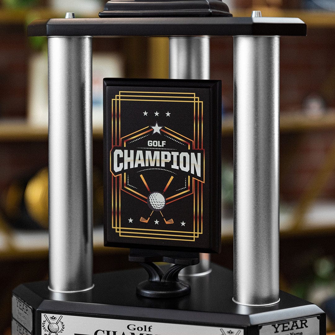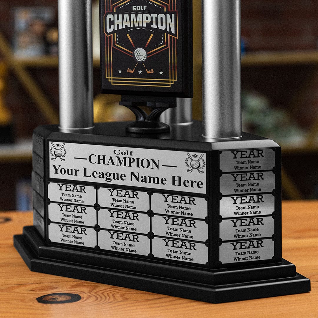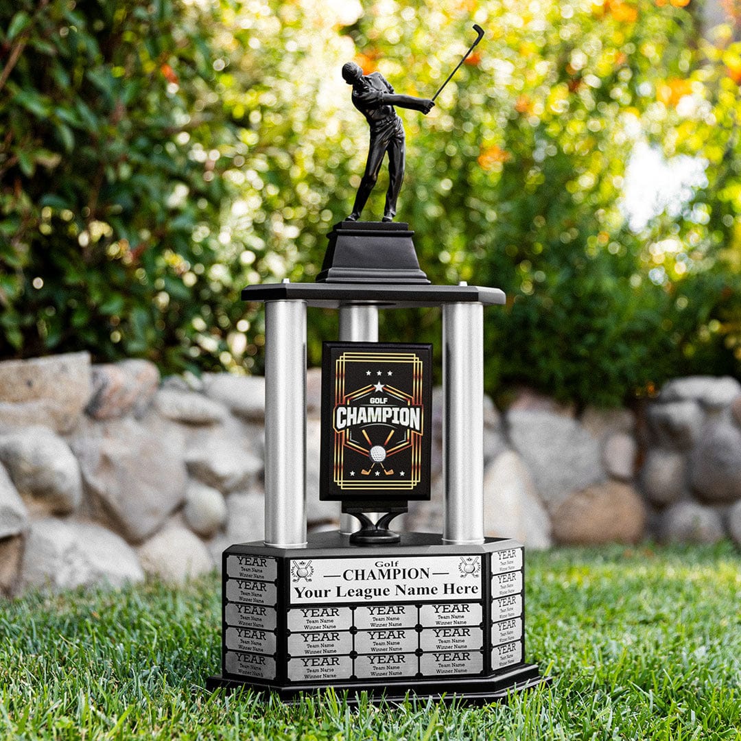 Celebrate your next achievement on the course with a custom golf trophy from TrophySmack. Our personalized golf trophies are perfect to commemorate any golfing event: from school teams to charity tournaments and more. They're also a great way to crown a fansty golf league winner. Our trophies hold up to 19 unique engraved nameplates to make this a perpetual trophy that will live on year after year.