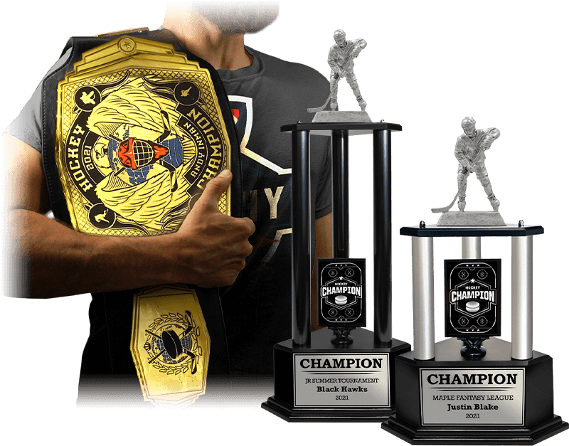 Whether it's a rec league or fantasy hockey league, commemorate your winning season with a custom trophy, championship belt, championship ring, and more.