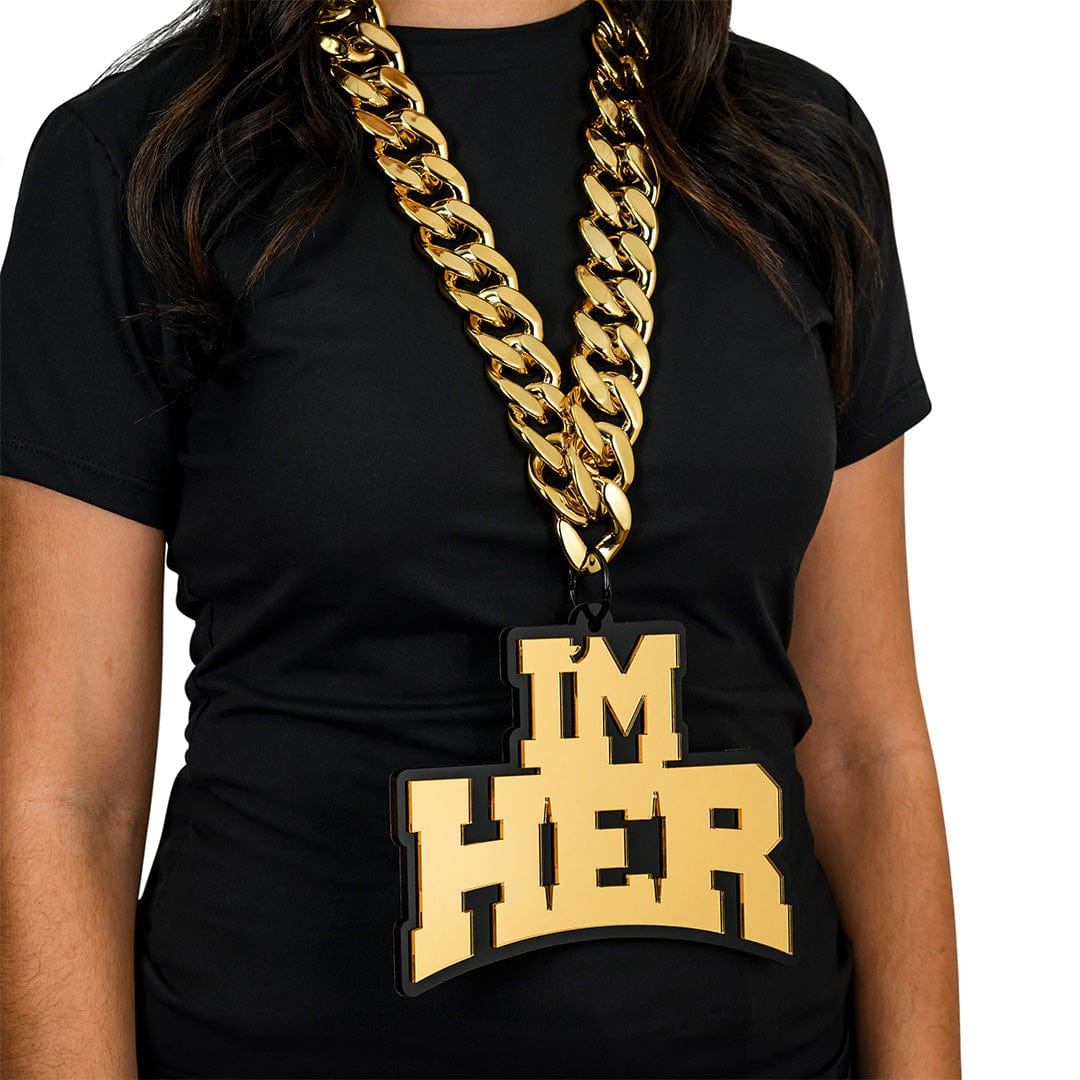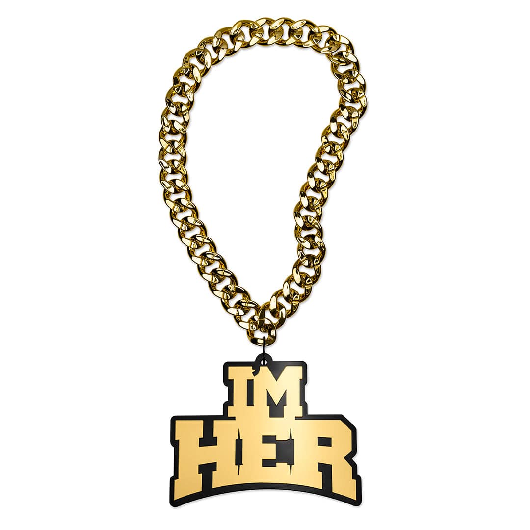 The "I'm Her" Gold Necklace is a bold, empowering accessory designed to make a statement. Crafted to showcase confidence and strength, this chain lets the world know you own your power. Wear it with pride and let everyone see you’re not just a part of the story—you’re the one writing it.