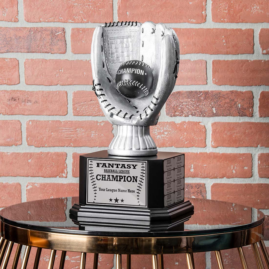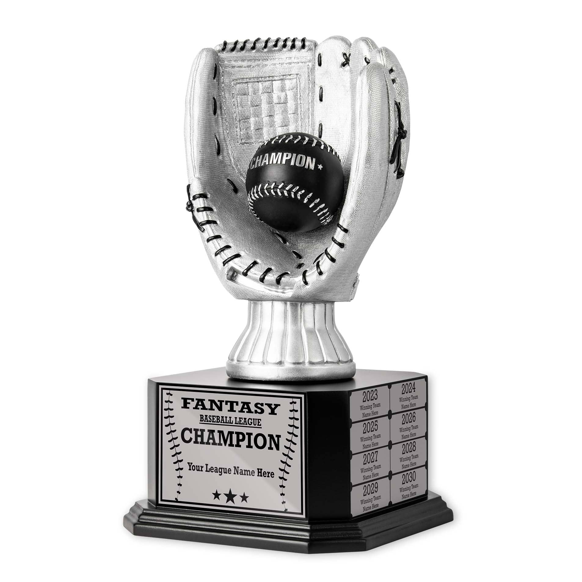 Our 15” Fantasy Baseball Trophy isn’t for the faint of heart. This powerful Fantasy Baseball Trophy sits on a 16-year perpetual base that commands the attention of all. It also reminds everyone in your league how bad you kicked their asses. Our glove and ball designs are not available anywhere else in the world…talk about an exclusive opportunity for greatness!