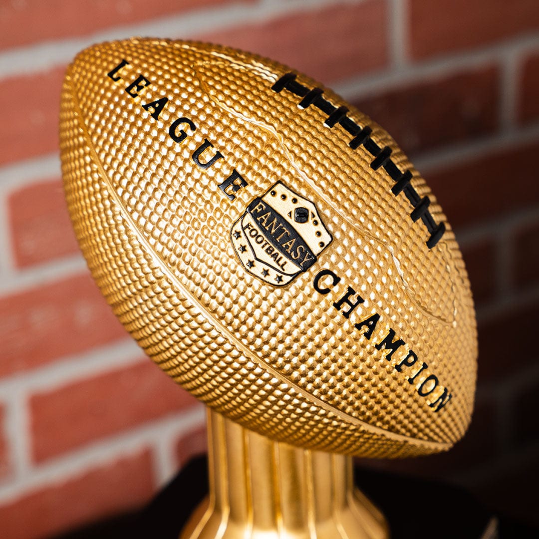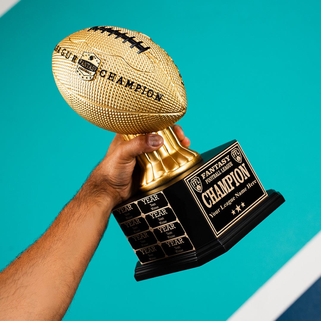 Our 15" Perpetual Fantasy Football Trophy - Gold Football isn’t for the faint of heart. This powerful Fantasy Football Trophy sits on a 16-year perpetual base that commands the attention of all. It also reminds everyone in your league how bad you kicked their asses. Our Perpetual Football designs are not available anywhere else in the world…talk about an exclusive opportunity for greatness!