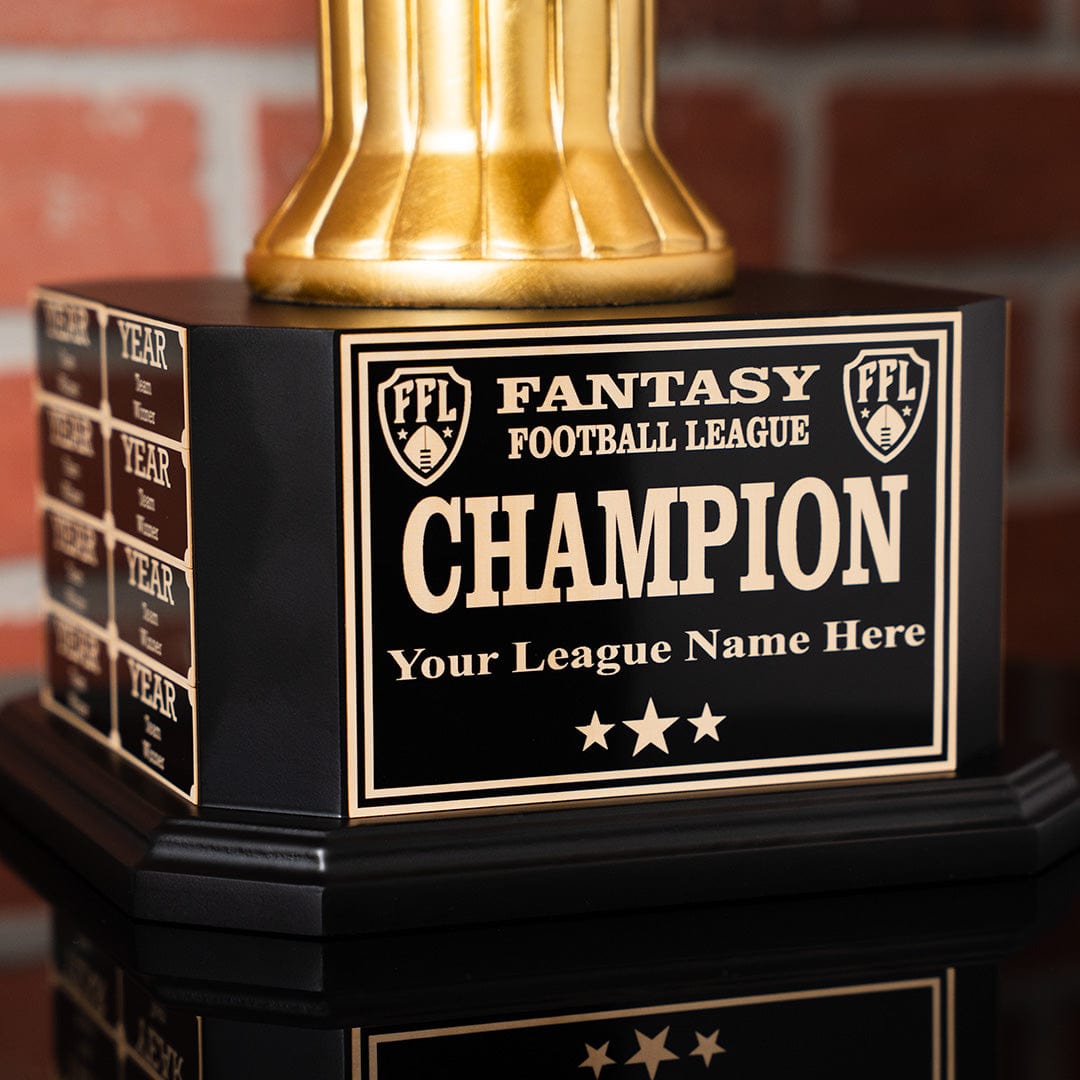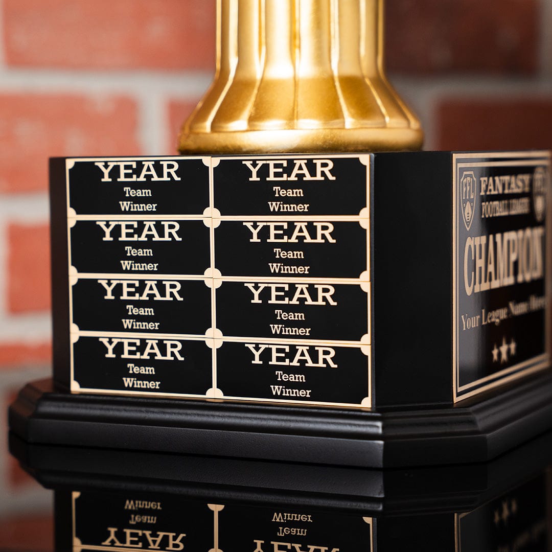 Do you see this beauty? Our Fantasy Football Perpetual Trophy is not for the faint of heart. This awe-inspiring Fantasy Football Trophy is built to command the attention of everyone, look great on your mantle, and remind each member of your league how badly you beat them. Our Perpetual Trophies are designed and manufactured only by TrophySmack - talk about an exclusive opportunity for greatness!