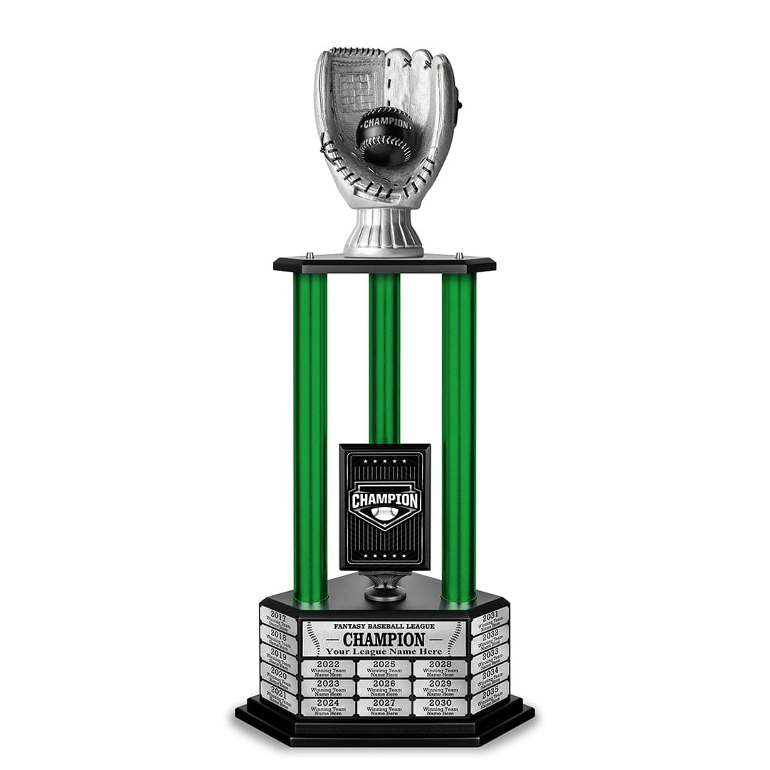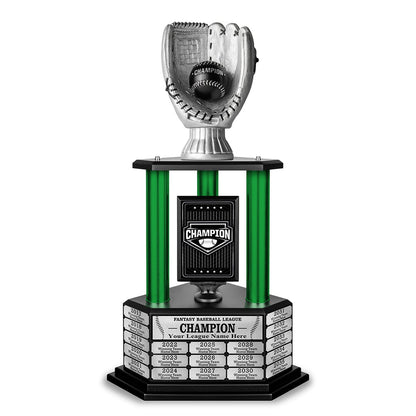 Our Fantasy Baseball Trophy isn’t for the faint of heart. This powerful Fantasy Baseball Trophy sits on a 19-year perpetual base that commands the attention of all. It also reminds everyone in your league how bad you kicked their asses.