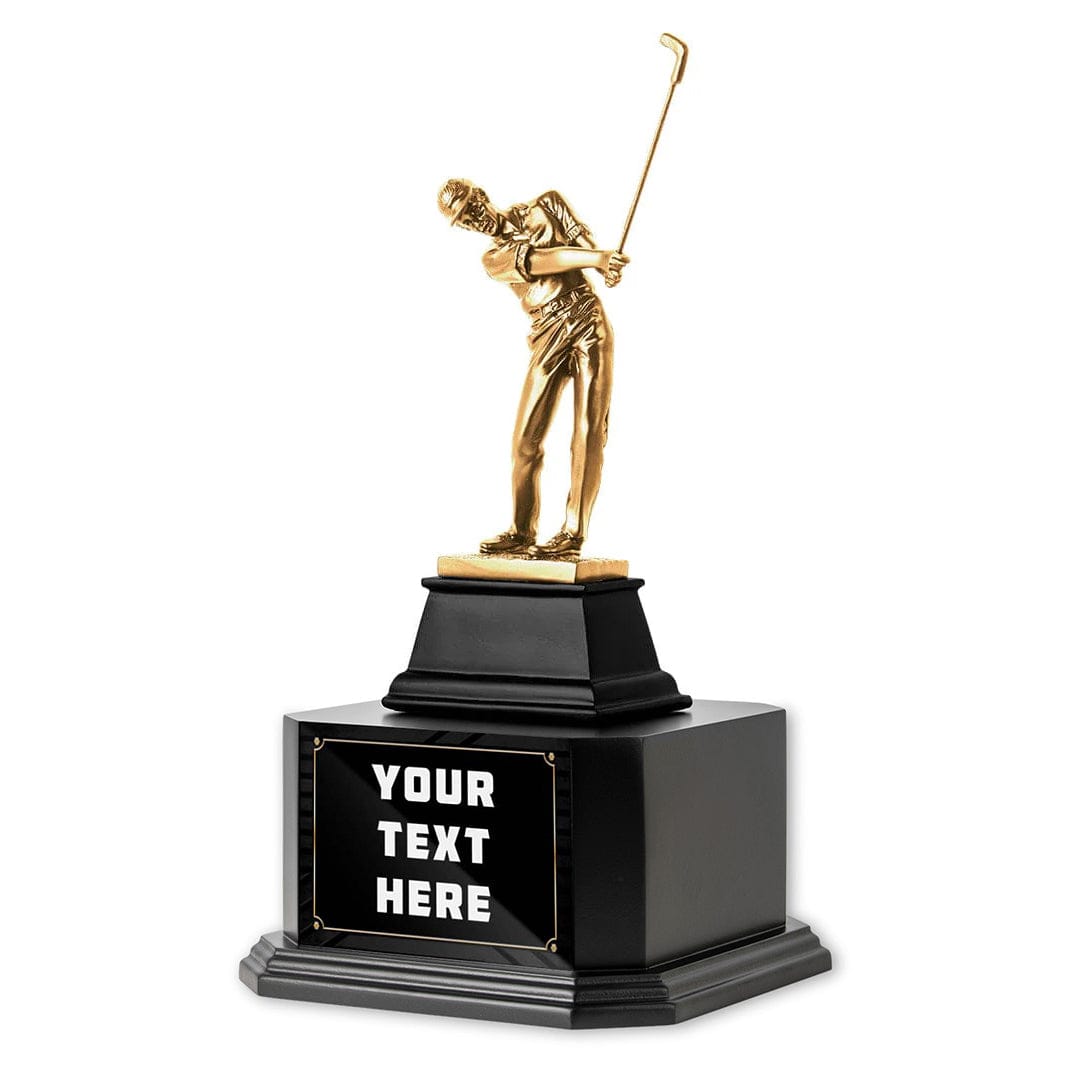 The Custom Golf Square Base Trophy features a customizable front plaque to celebrate the champion in your in-person or fantasy golf league! The golfer-shaped trophy topper sits on a solid wooden square base, commemorating your epic moment. Perfect for youth leagues too!