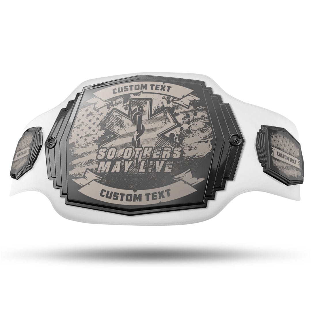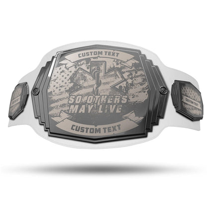 EMS workers, we salute you! In honor of your services, we've created the EMS Engraved Championship Belt. The plates on this belt are laser engraved, rather than UV printed, making this belt feel luxurious... fit for a hero. And they're a smooth gunmetal gray, which makes them stand out from other championship belts. So hoist this bad boy high above your head while we celebrate the epic human being that you are!