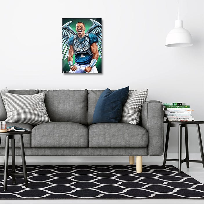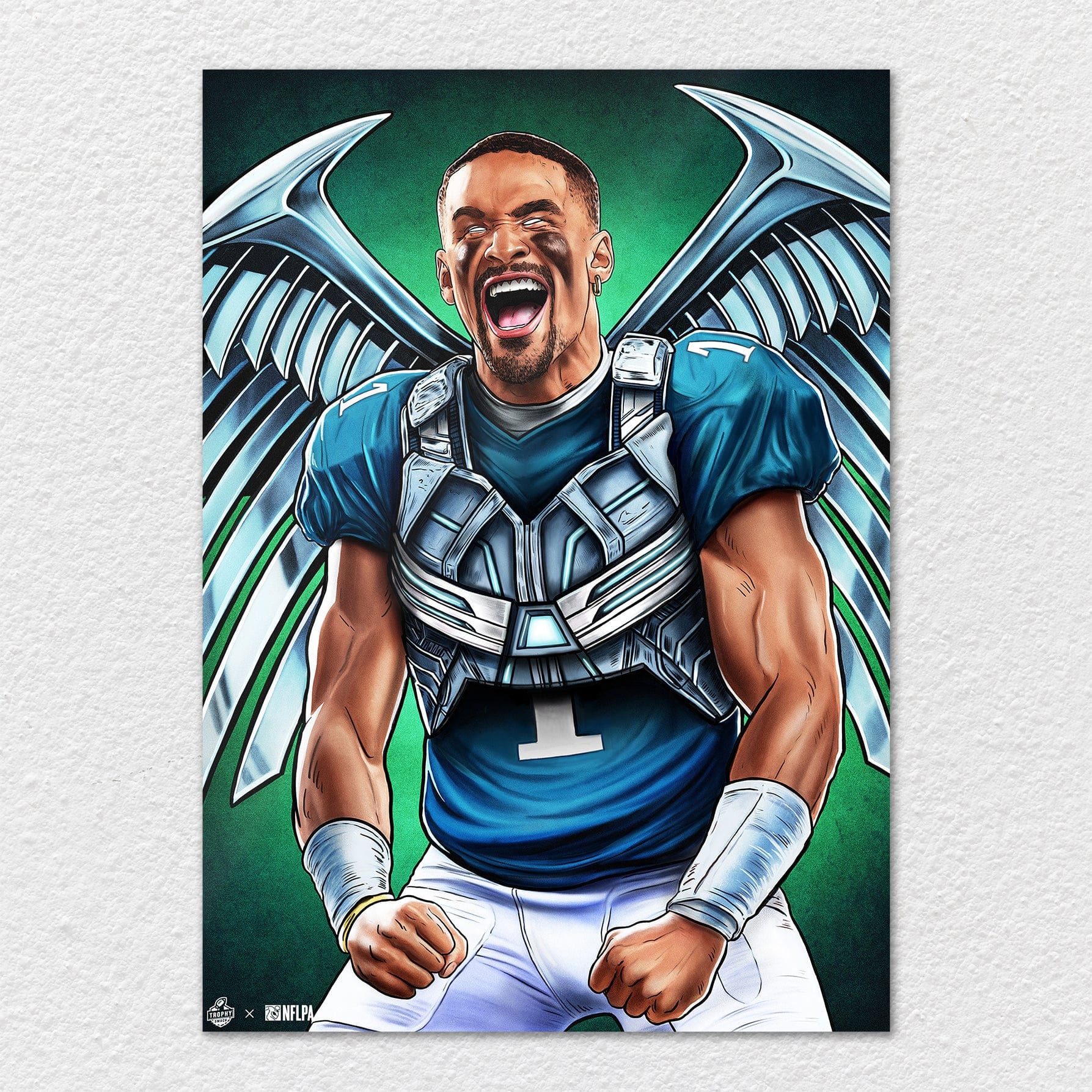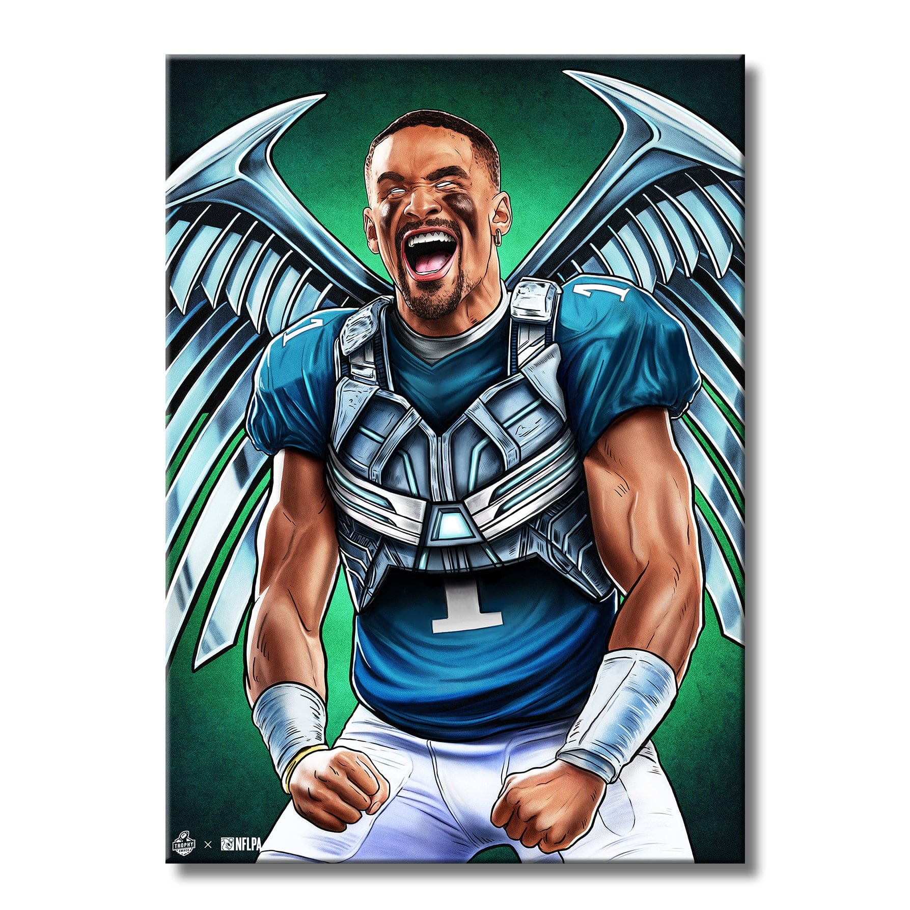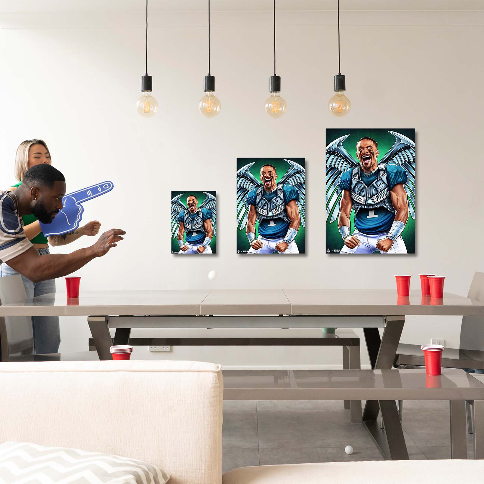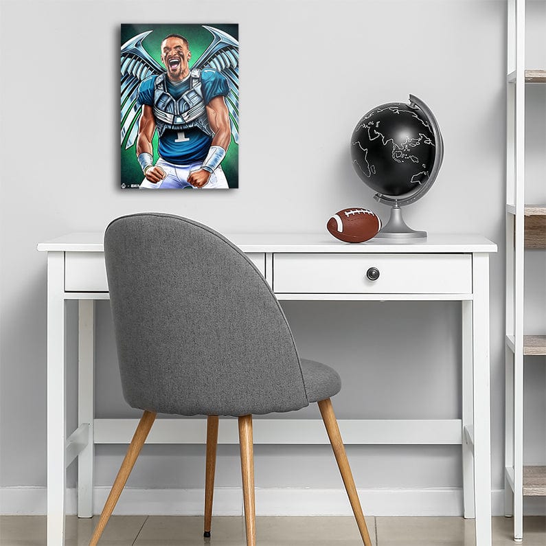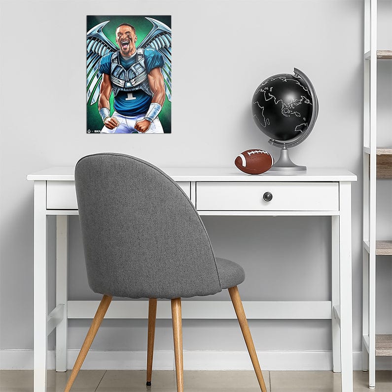 Don't be a pigeon when you were born to be an Eagle! The Philadelphia Eagles NFL Quarterback, Jalen Hurts, showed the world what he was made of. Show the world your fandom with this exclusive piece of metal wall art designed by TrophySmack commissioned artist, Cuyler Smith. Add some interest to your otherwise boring wall with WallSmack, by TrophySmack. This high-gloss, sturdy, stainless steel work of art is officially licensed by the NFLPA. It even comes with a wall-safe magnetic mount.