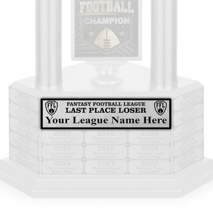 Customize your trophy with your own engraved league plate, reminding the world what league you sucked and took last place in. While showcasing your custom trophy. (trophies sold separately)