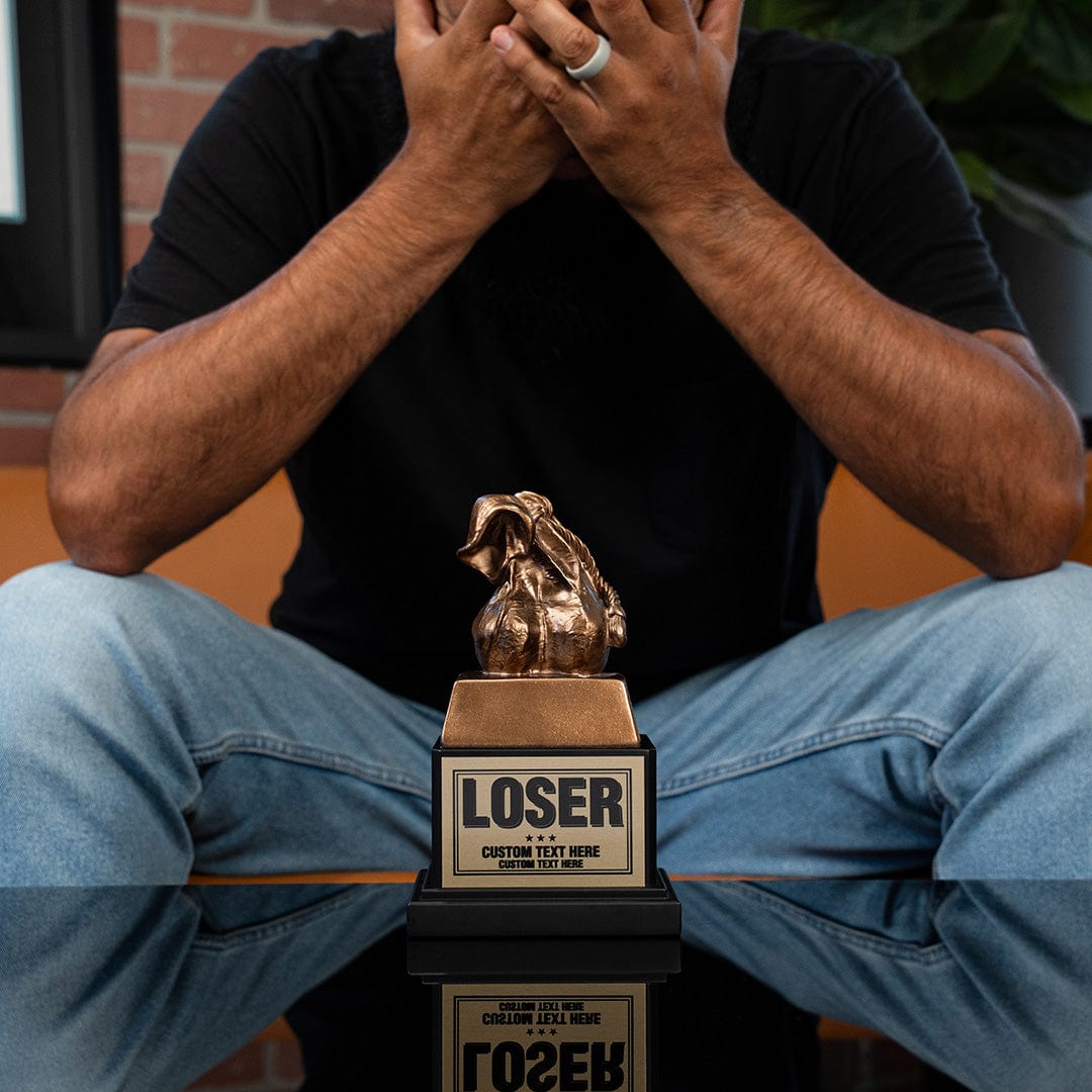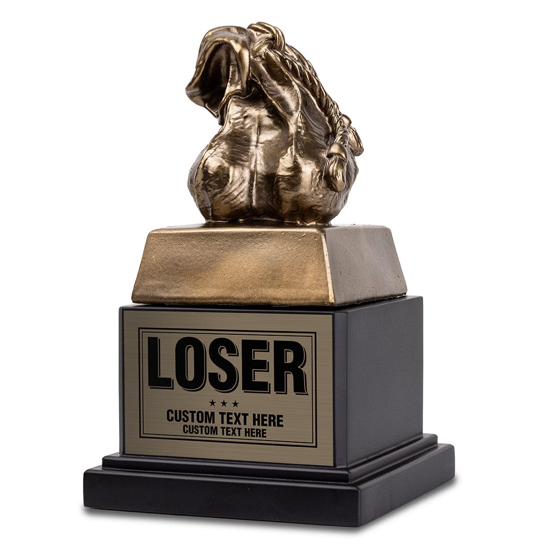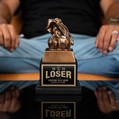 The Sacko Loser Trophy isn’t just punishment—it’s a bronze reminder you dropped the ball when it mattered most. Mounted on a mini base and finished with your choice of plaques: Fantasy Football Loser or All-Purpose Shame. Part of our Hall of Losers collection, it makes sure your misstep doesn’t go unnoticed.