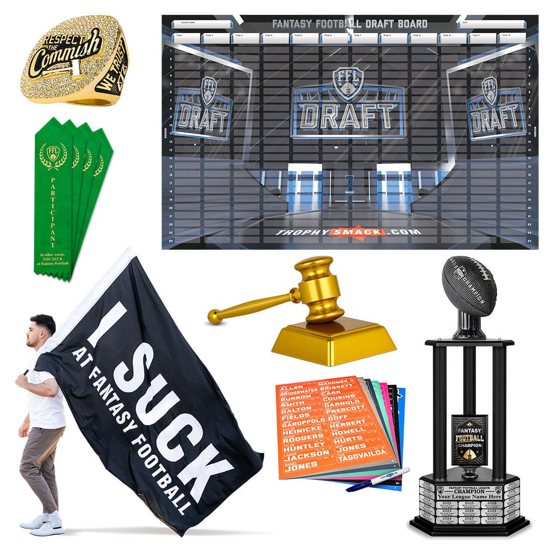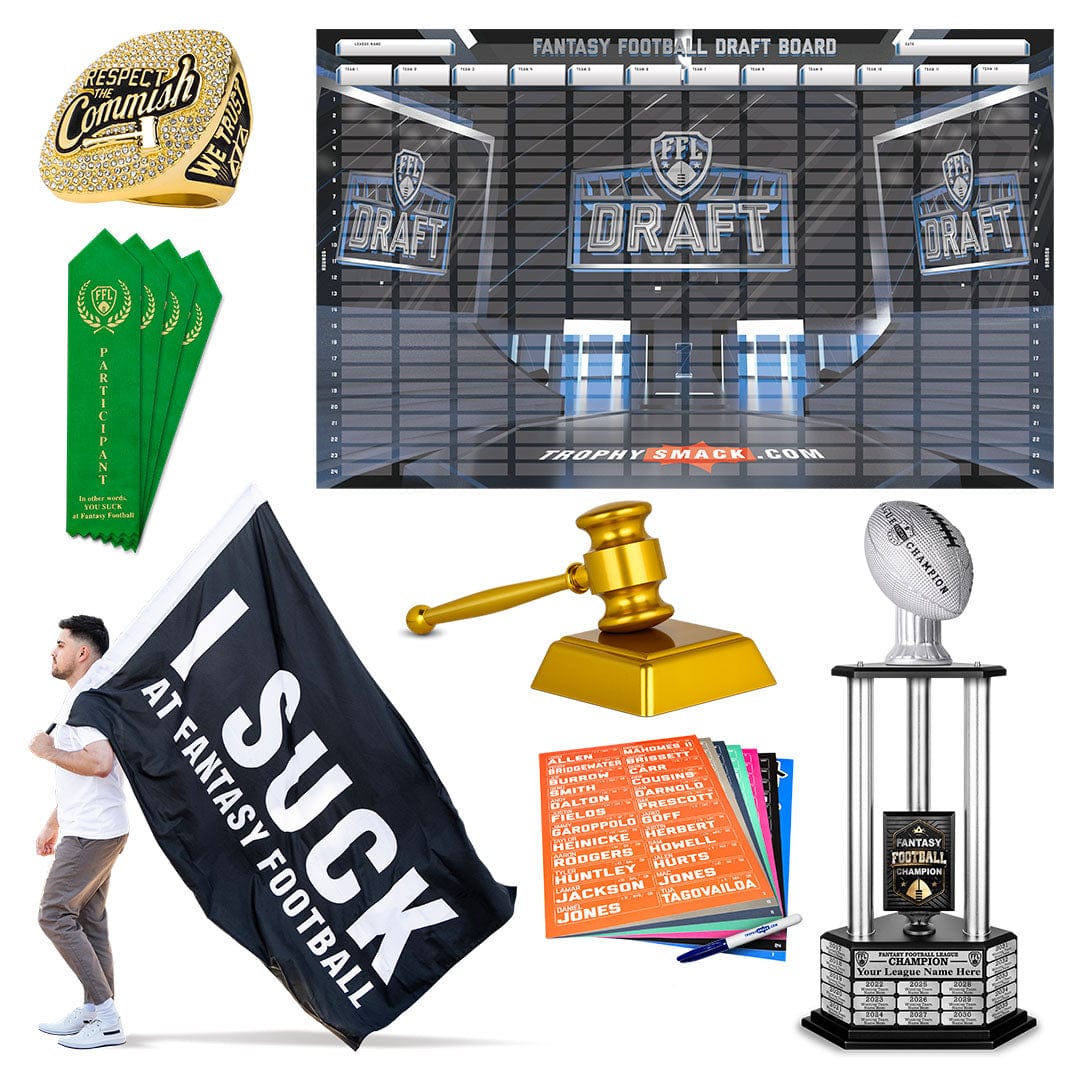 Ensure the success of your Fantasy Football draft party with the TrophySmack Ultimate Fantasy Football Draft Party Kit! This draft board bundle has everything you need to elevate your league to the next level. Complete with a Respect the Commish Championship Ring and Gavel, Championship Fantasy Football Trophy, Loser Flag, and more! Fantasy Football draft parties are meant to be live, so gather your league around this impressive draft board and experience competition at its best.