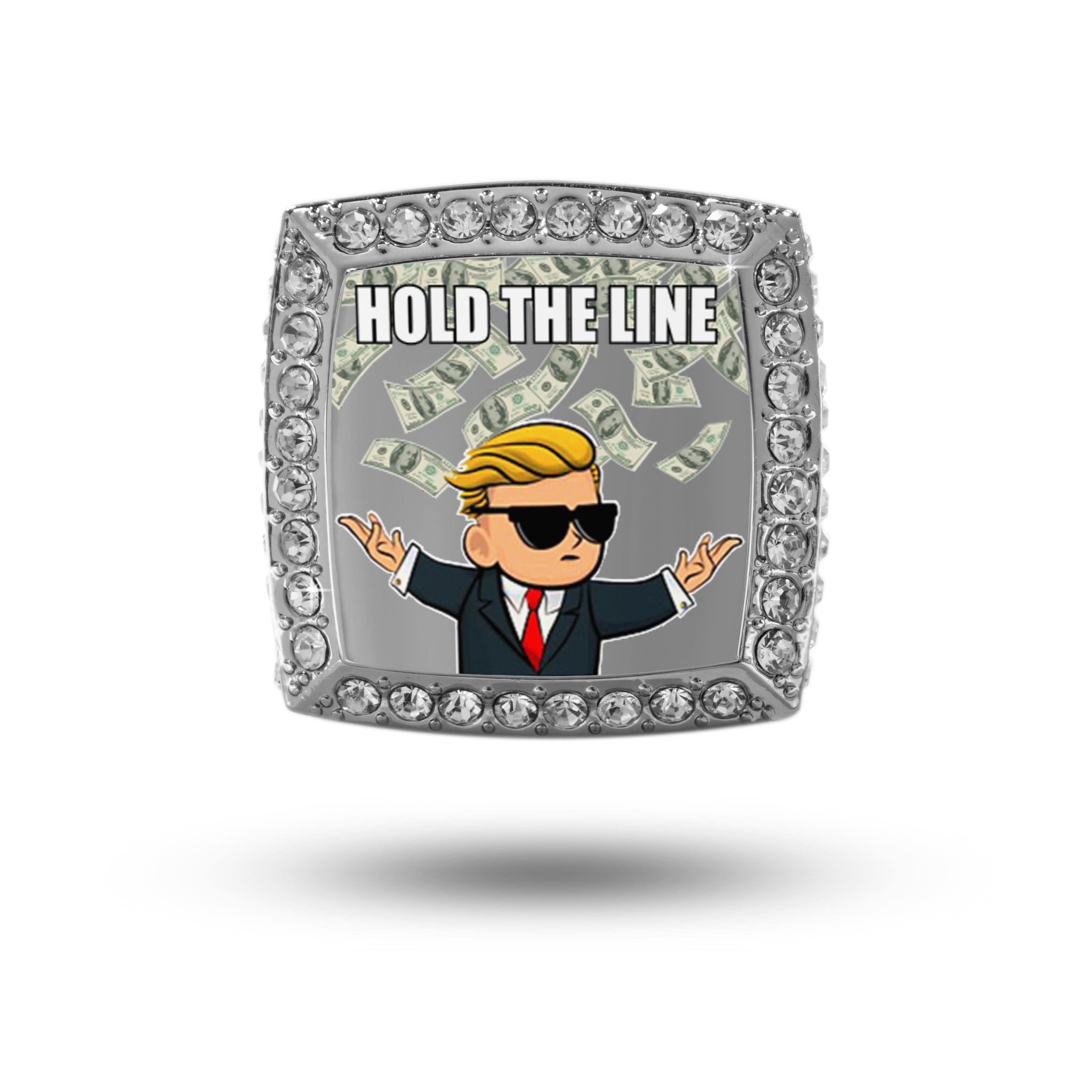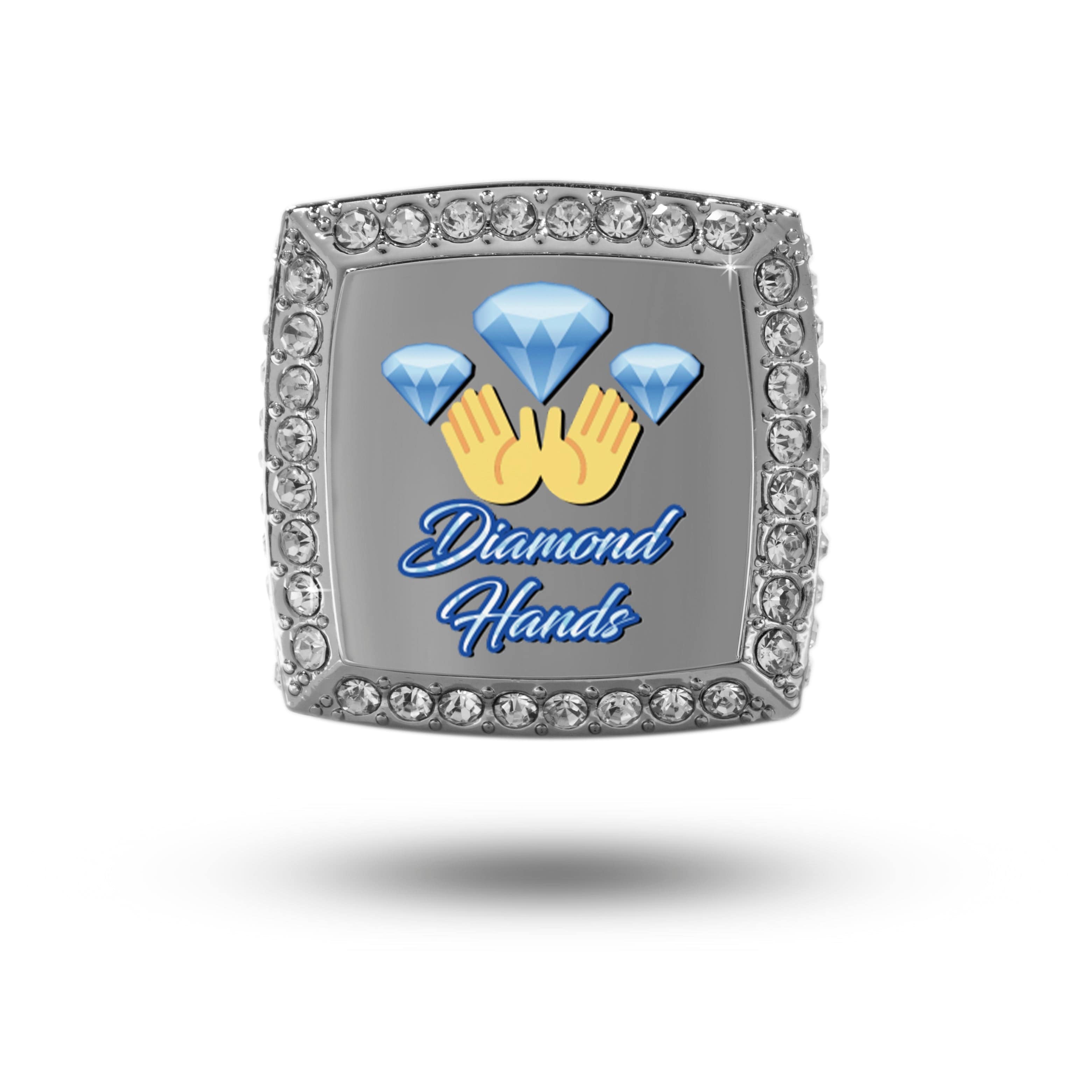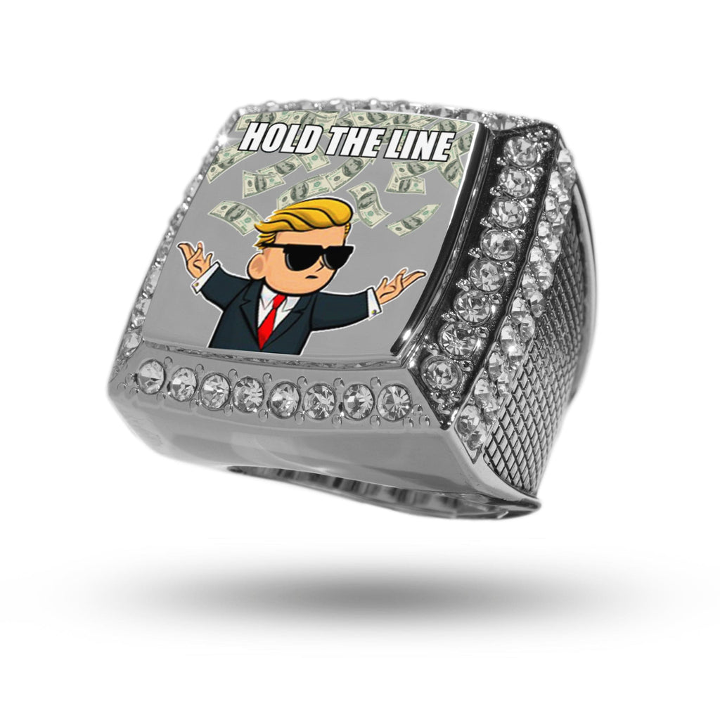 Our Wall Street Bets Hold the Line Bling Ring is covered in over 69 genuine not real diamonds and sparkles like the sun. It's solid metal and can double as a paperweight or as a way to impress your colleagues. Each ring is hand-crafted and polished for maximum envy. Ring size approximately 12. Let's be honest, it's a showpiece, not your grandma's heirloom jewelry. Perfect to celebrate a winning day at the closing bell. Meant for display only.